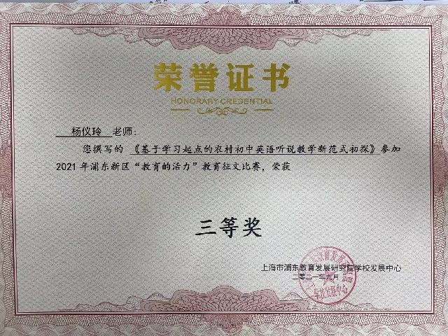 | 杨仪玲获2021年浦东新区“教育的活力”教育征文比赛三等奖 |