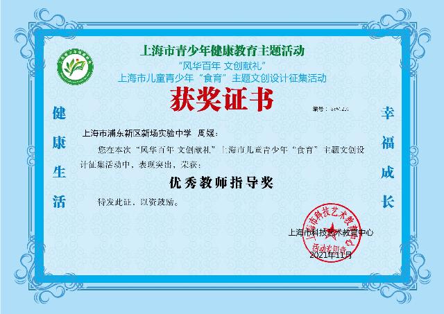 | 周媛获“风华百年文创献礼”上海市儿童青少年“食育”主题文创设计征集活动优秀教师指导奖 |