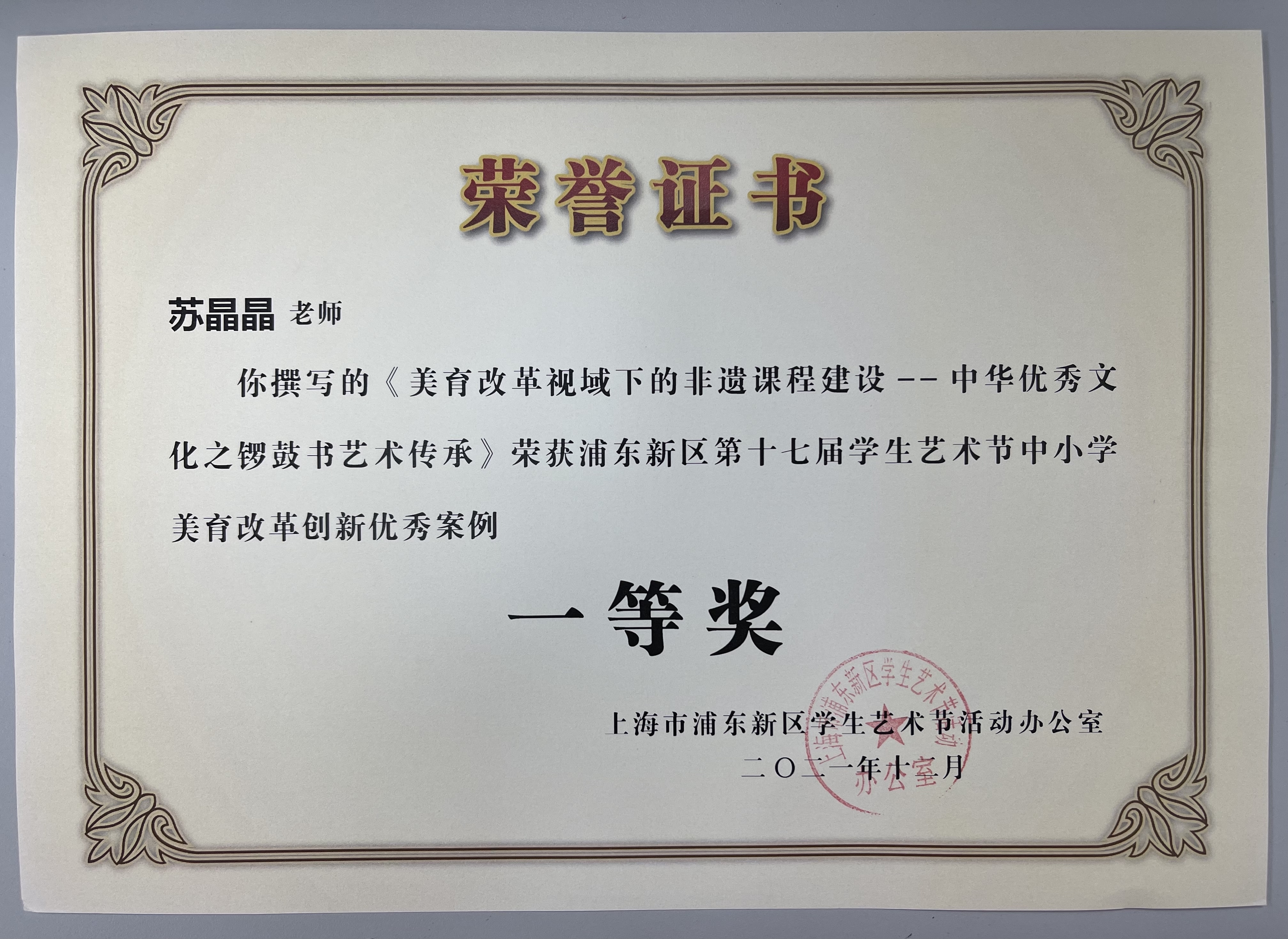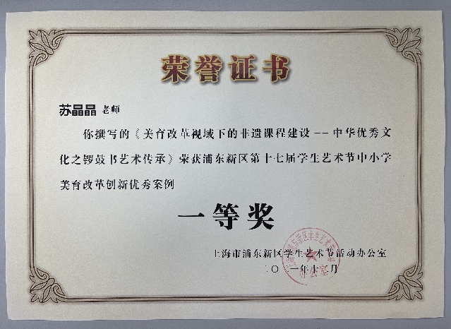 | 苏晶晶获撰写的《美育改革视域下的非遗课程建设——中华优秀文化之锣鼓书艺术传承》荣获浦东新区第十七届学生艺术节中小学美育改革创新优秀案例一等奖 |