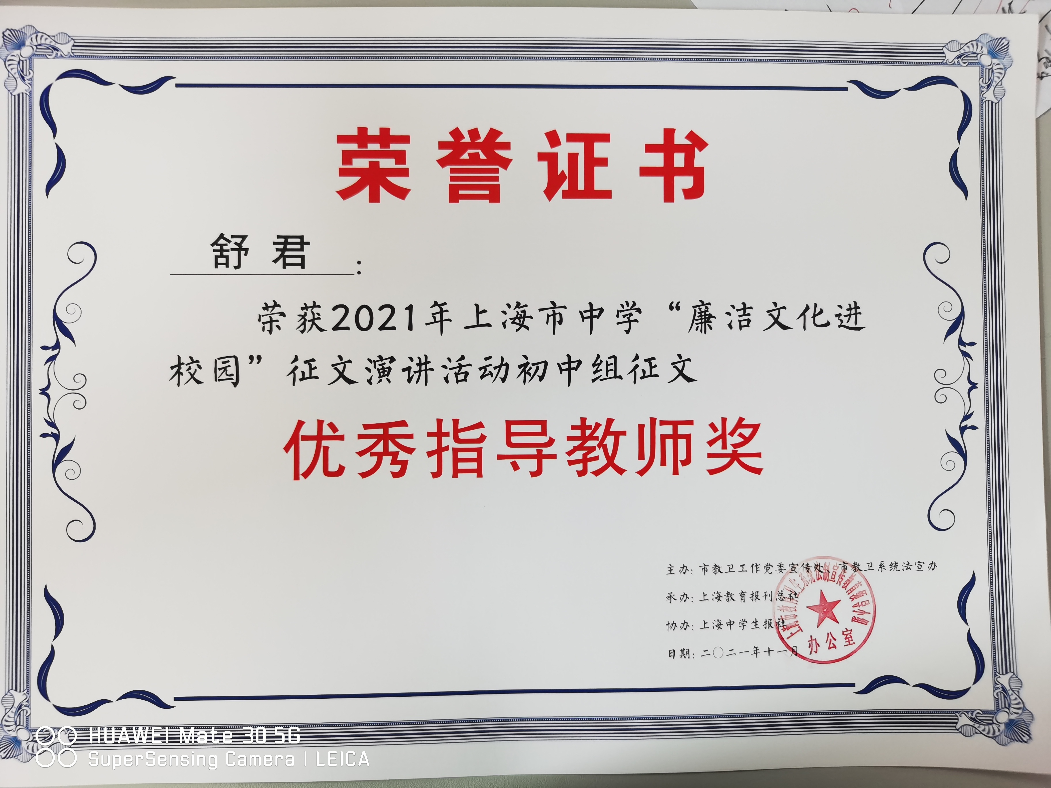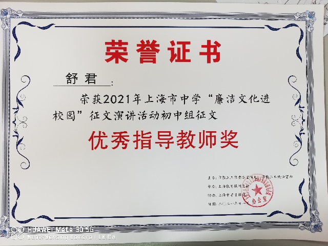 | 舒君获荣获2021年上海市中学“廉洁文化进校园”征文演讲活动初中组征文优秀指导教师奖 |