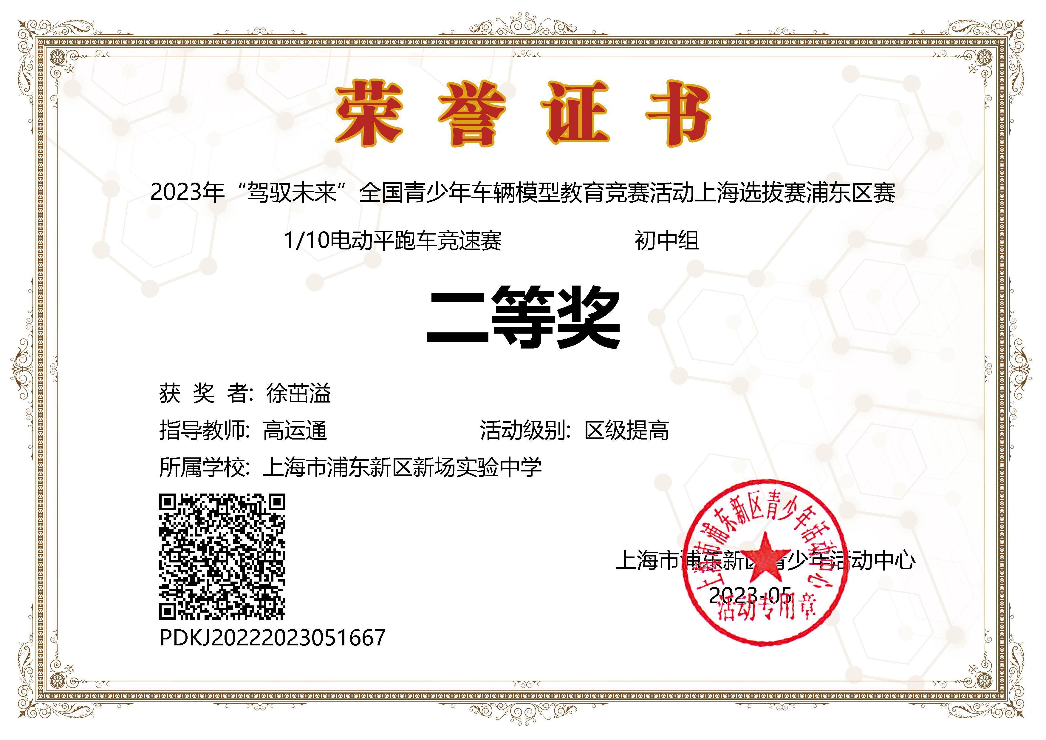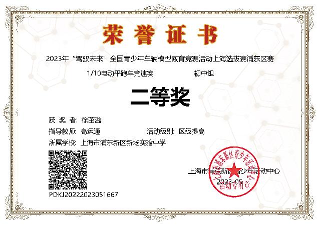 | 徐茁溢获2023年“驾驭未来”全国青少年车辆模型教育竞赛活动上海选拔赛浦东区赛--110电动平跑车竞速赛初中组二等奖 |