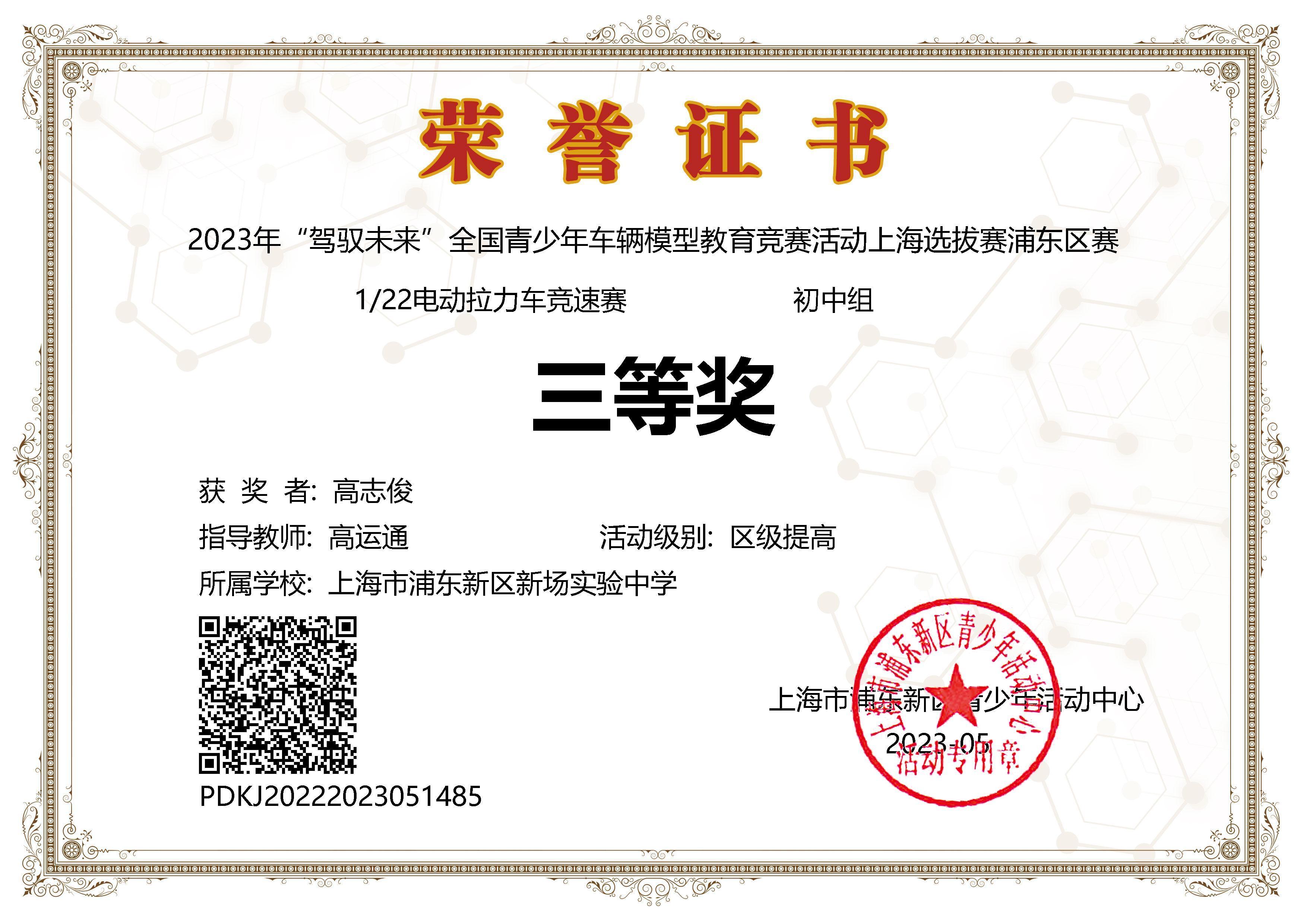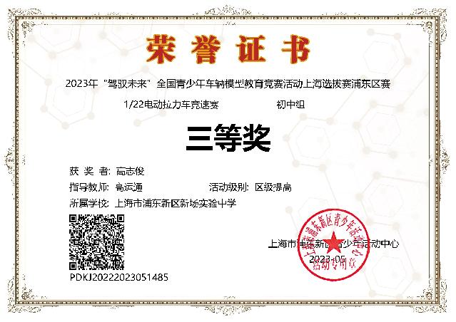 | 高志俊获2023年“驾驭未来”全国青少年车辆模型教育竞赛活动上海选拔赛浦东区赛--122电动拉力车车竞速赛初中组三等奖 |