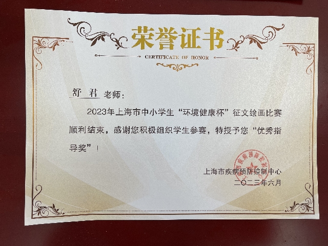 | 舒君获2023年上海市中小学生“环境健康杯”征文绘画比赛顺利结束,感谢您积极组织学生参与,特授予您优秀指导奖 |