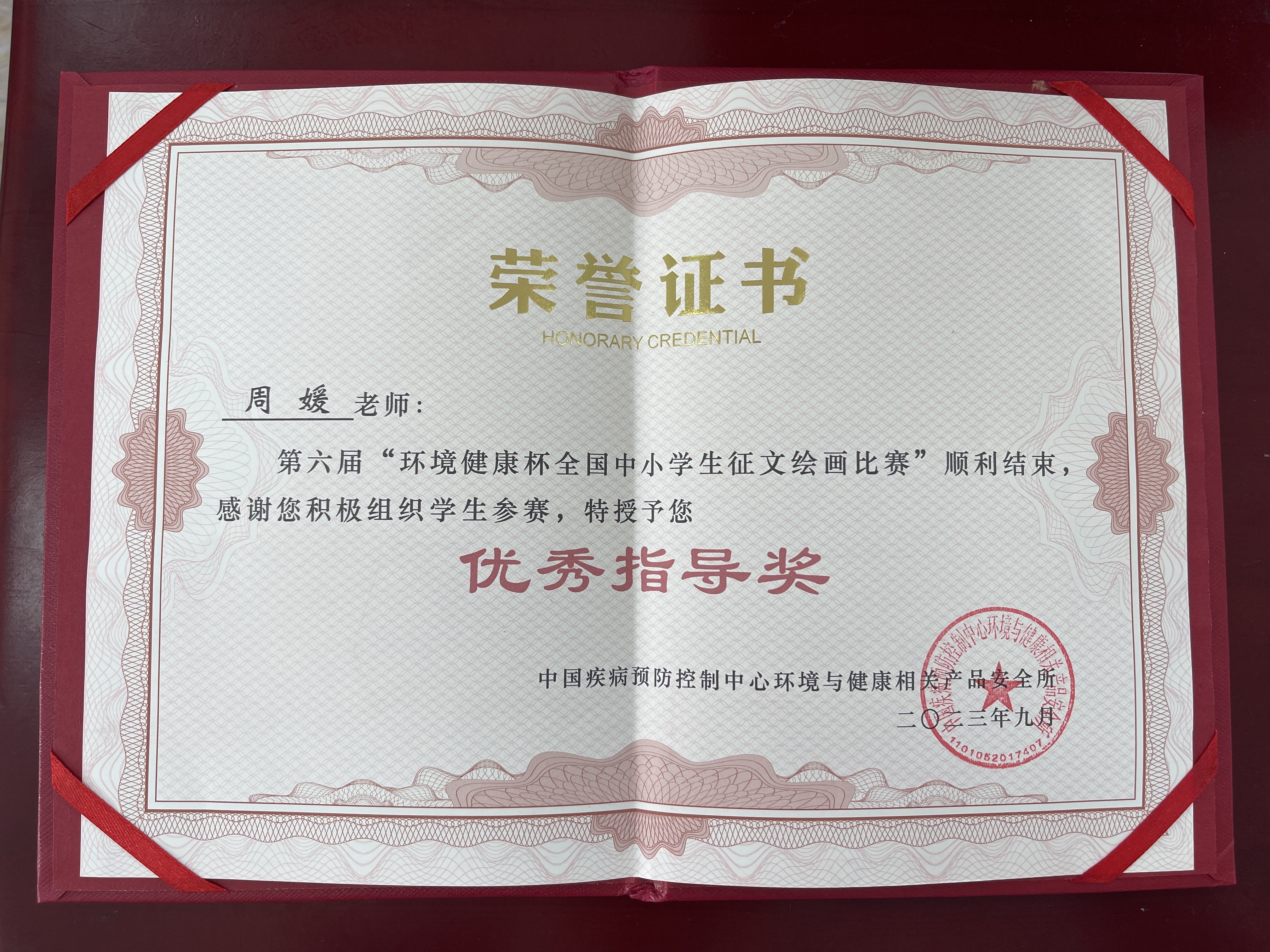 | 周媛获第六届“环境健康杯全国中小学征文绘画比赛”顺利结束,感谢您积极组织学生参赛,特授予您优秀指导奖 |