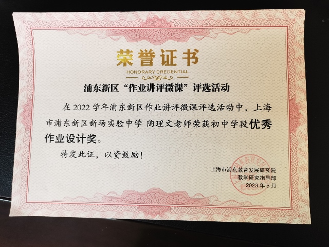 | 陶理文获浦东新区“作业讲评微课”评选活动优秀作业设计奖 |