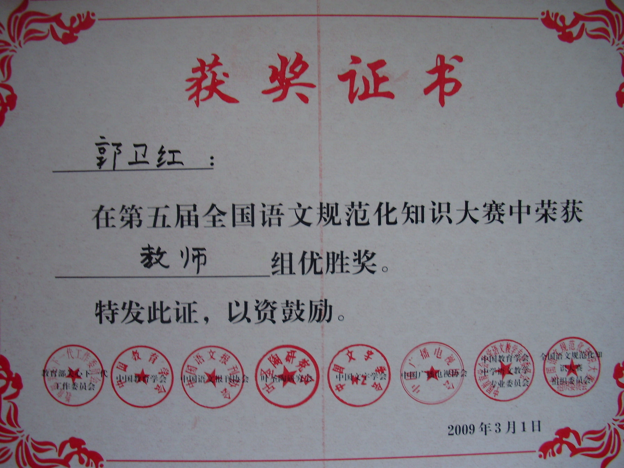 | 郭卫红获第五届全国语文规范化知识大赛教师组优胜奖 |