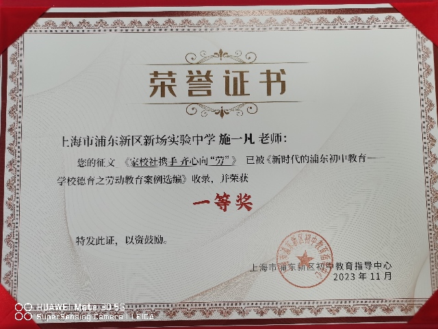 | 施一凡获您的征文《家校社携手齐心向“劳”》已被《新时代的浦东初中教育——学校德育之劳动教育案例选编》收录,并荣获一等奖 |