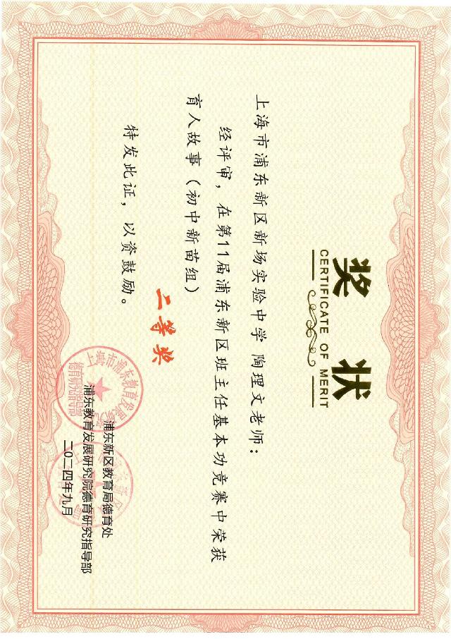 | 陶理文获第11届浦东新区班主任基本功竞赛育人故事(初中新苗组)二等奖 |