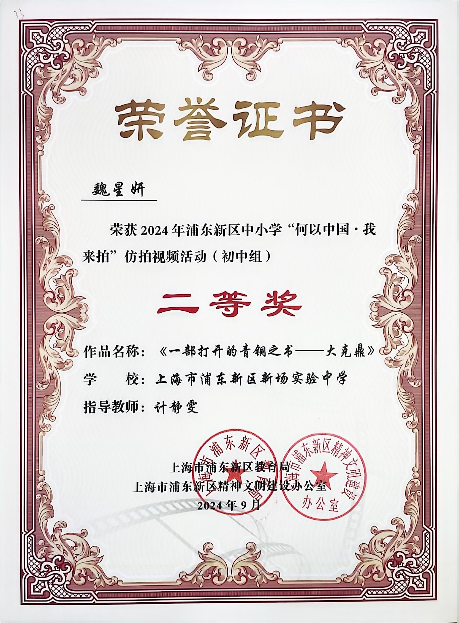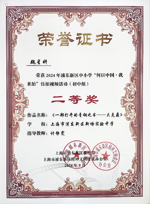 | 魏星妍获2024年浦东新区中小学“何以中国·我来拍”仿拍视频活动(初中组)二等奖 |