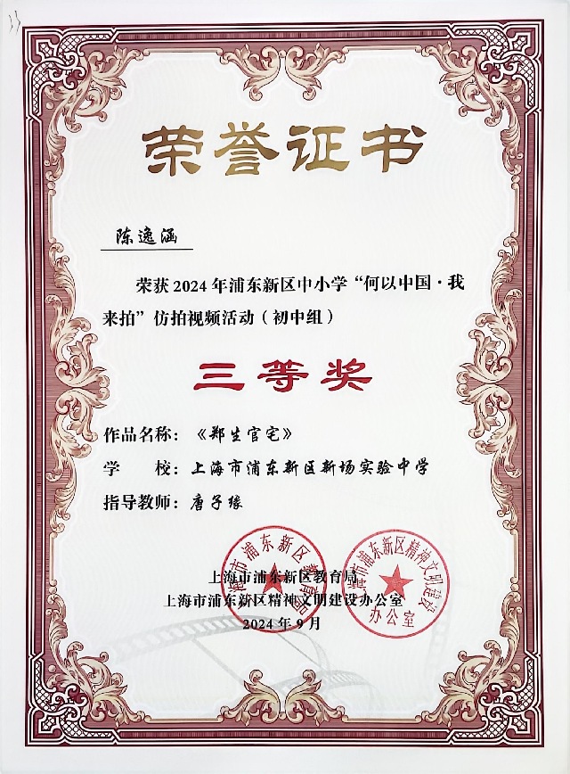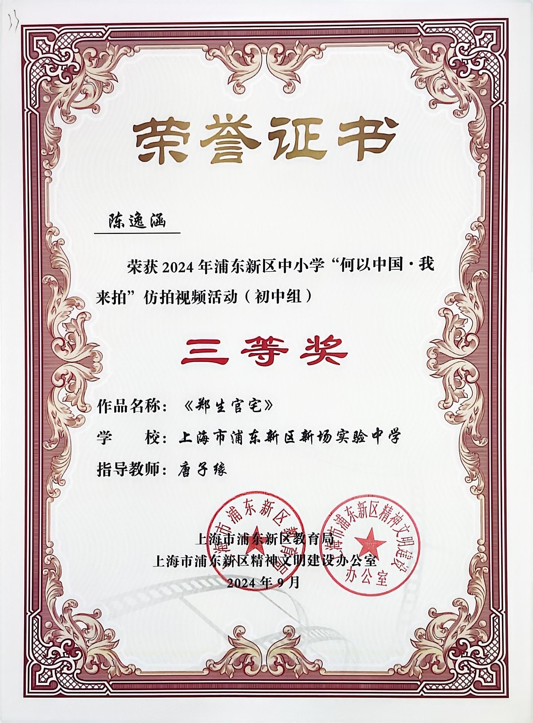 | 陈逸涵获2024年浦东新区中小学“何以中国·我来拍”仿拍视频活动(初中组)三等奖 |