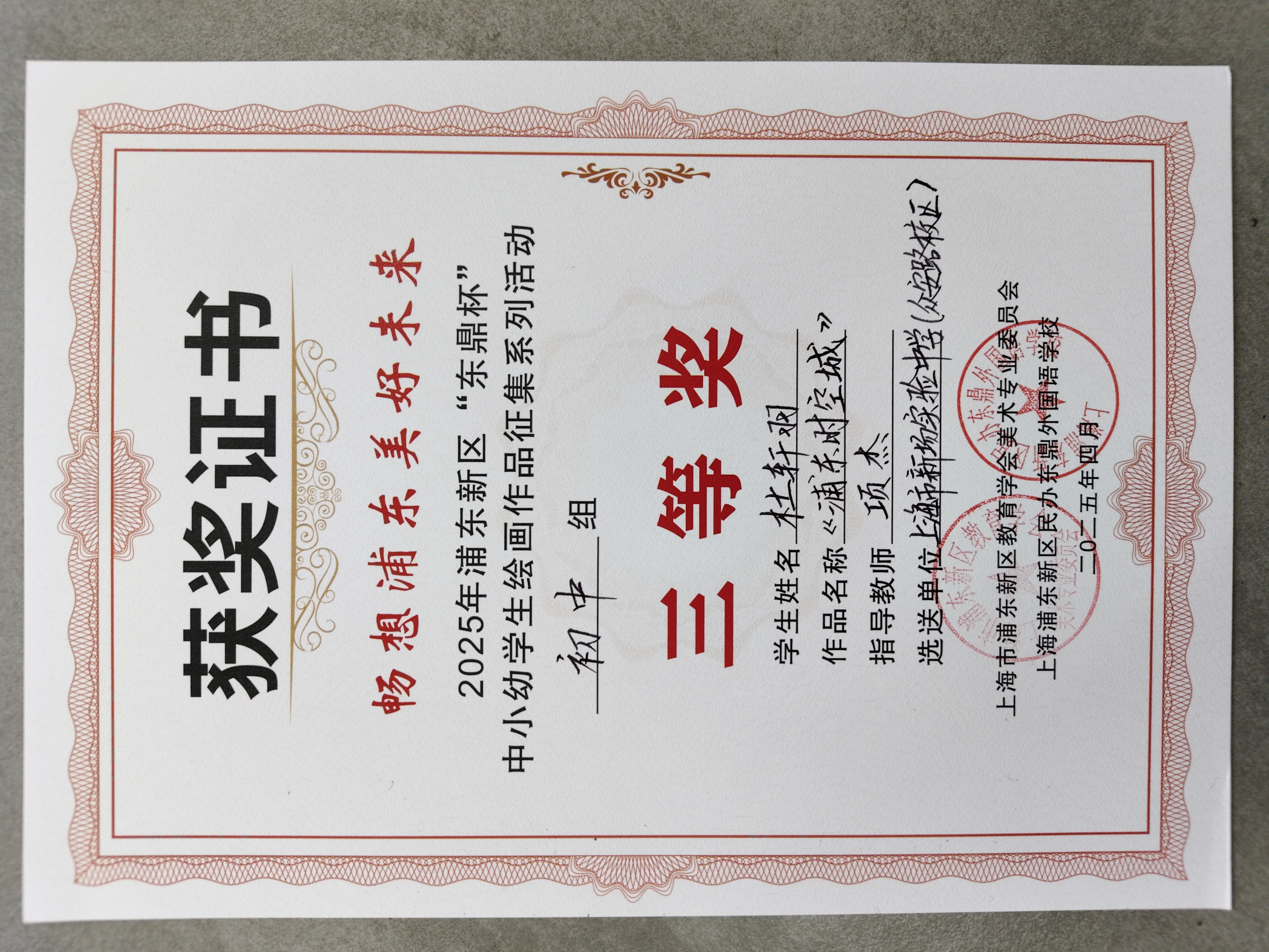 | 杜轩羽获畅想浦东美好未来 2025年浦东新区“东鼎杯” 中小幼学生绘画作品征集系列活动初中组三等奖 |