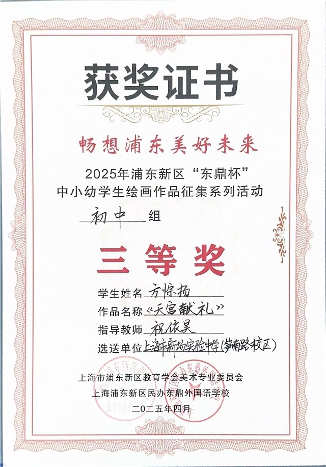 | 方悰扬获畅想浦东美好未来 2025年浦东新区“东鼎杯” 中小幼学生绘画作品征集系列活动初中组三等奖 |