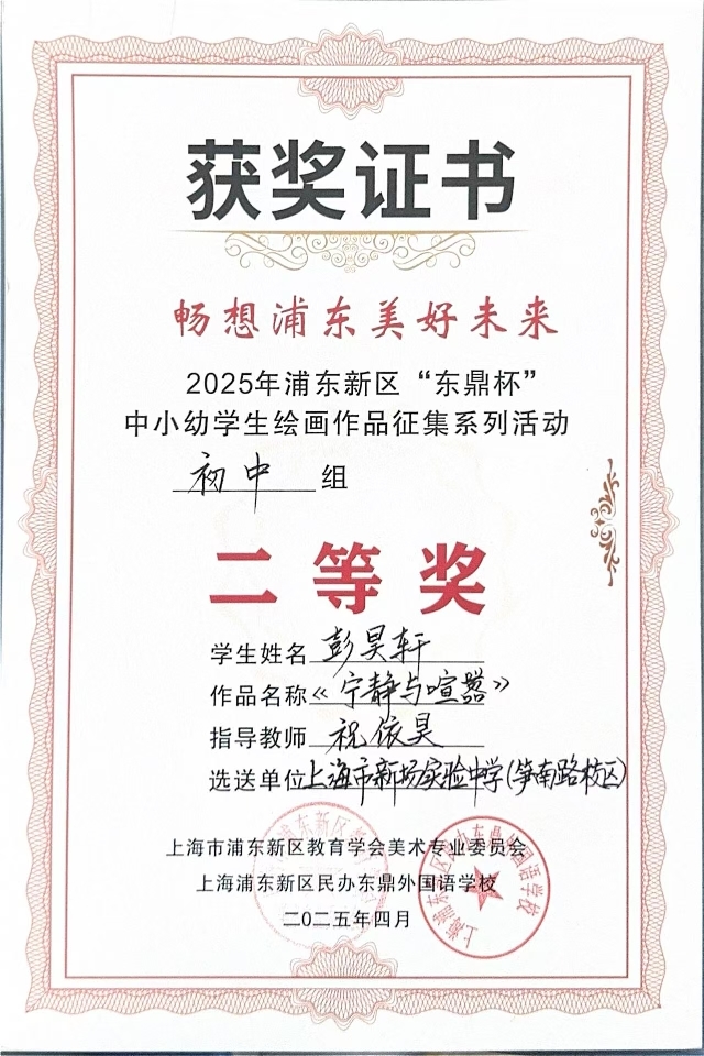 | 彭昊轩获畅想浦东美好未来 2025年浦东新区“东鼎杯” 中小幼学生绘画作品征集系列活动初中组二等奖 |