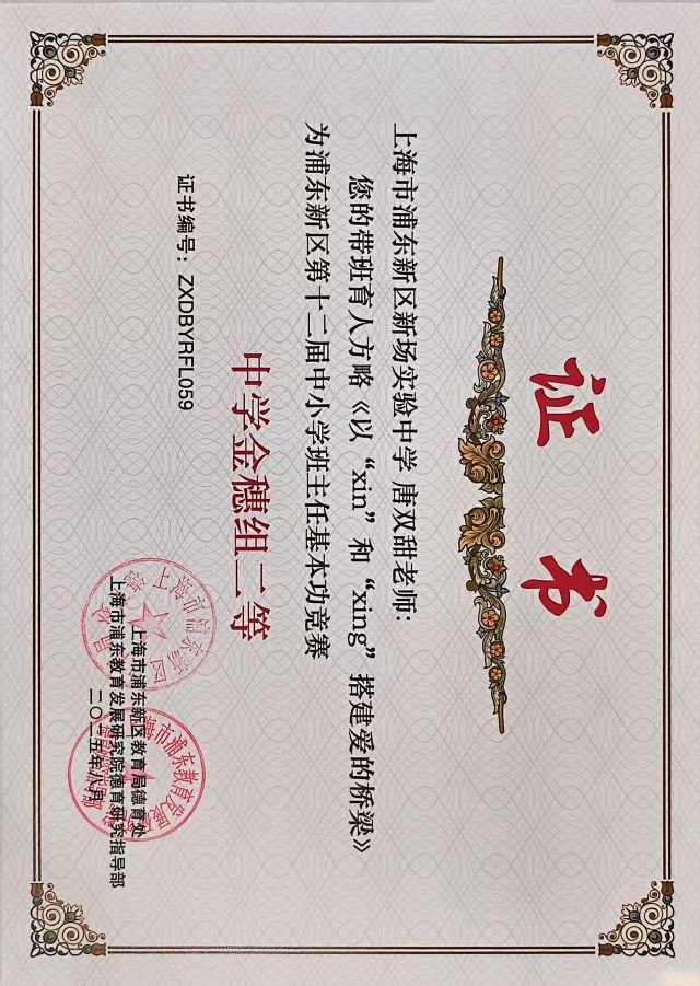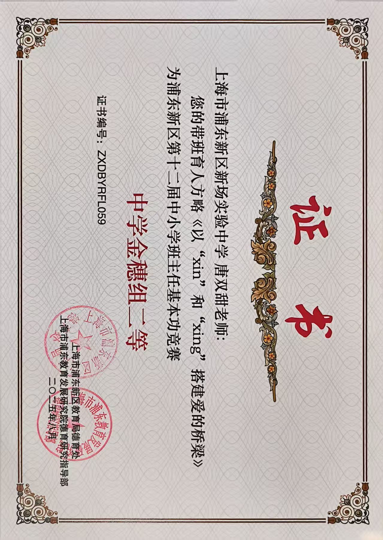 | 唐双甜获浦东新区第十二届中小学班主任基本功竞赛带班育人方略 中学金穗组二等奖 |