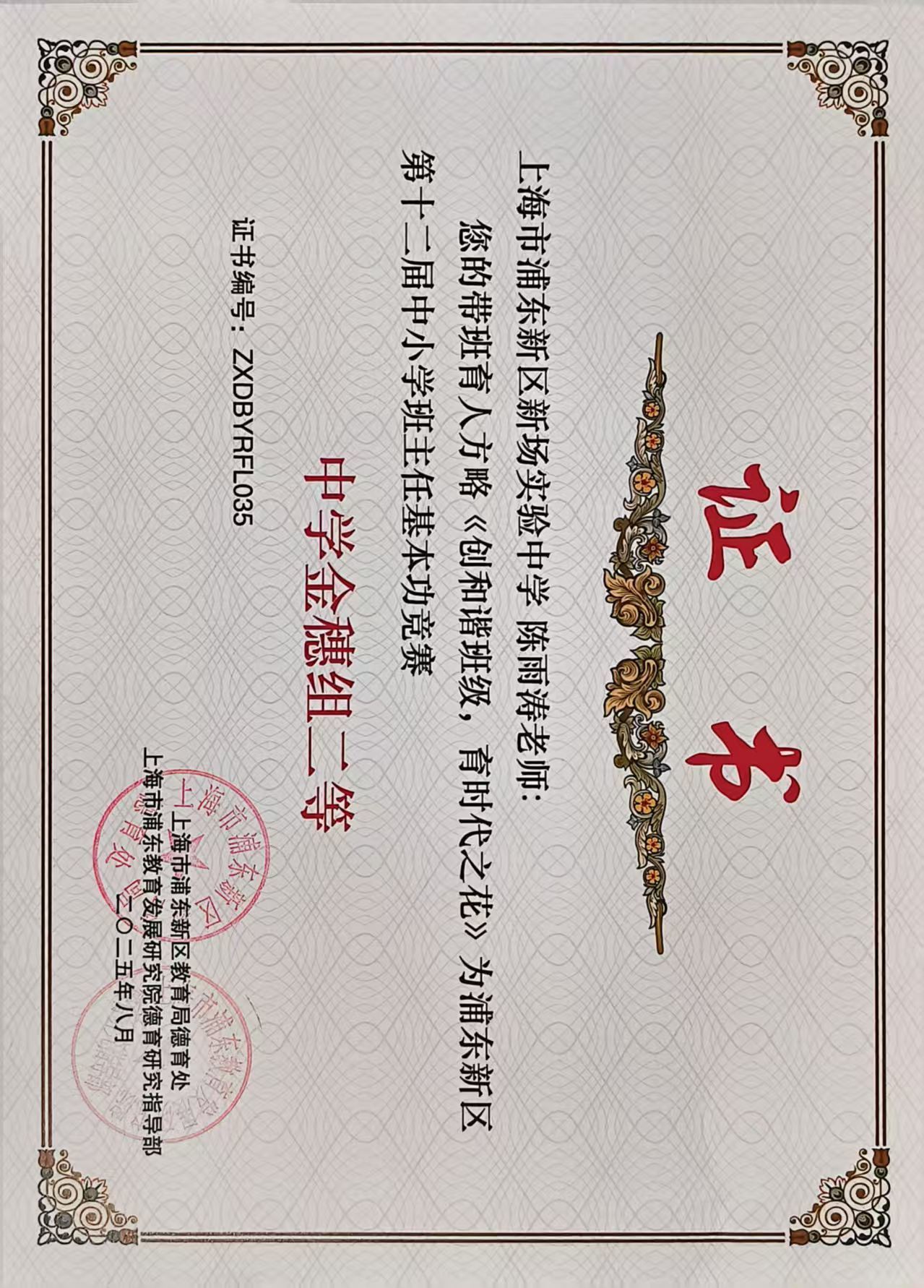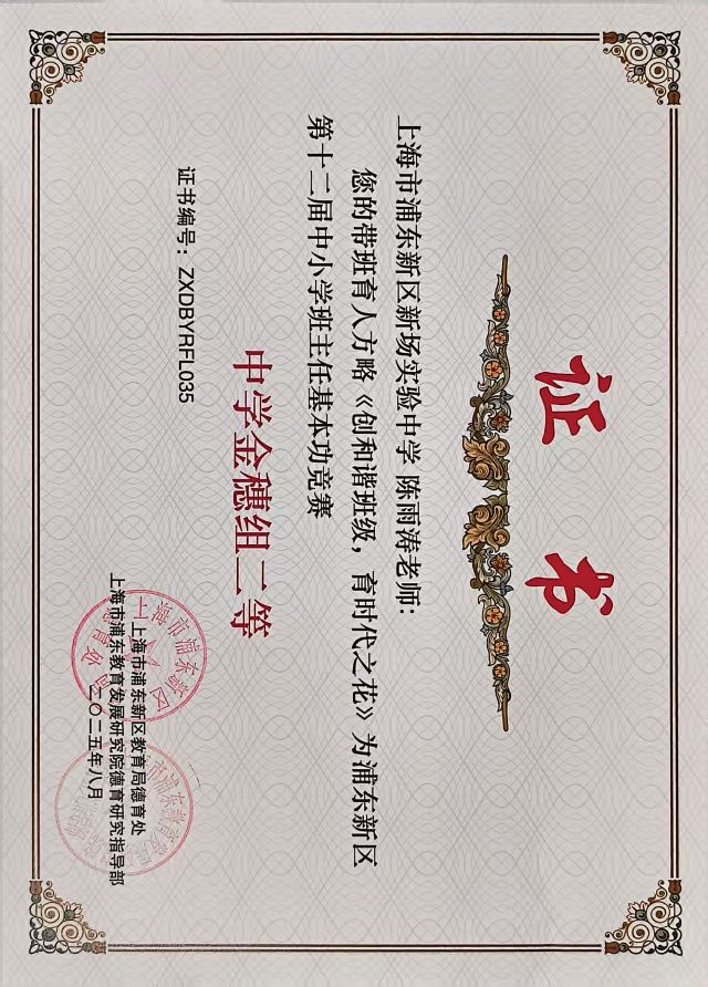 | 陈雨涛获浦东新区第十二届中小学班主任基本功竞赛带班育人方略 中学金穗组二等奖 |