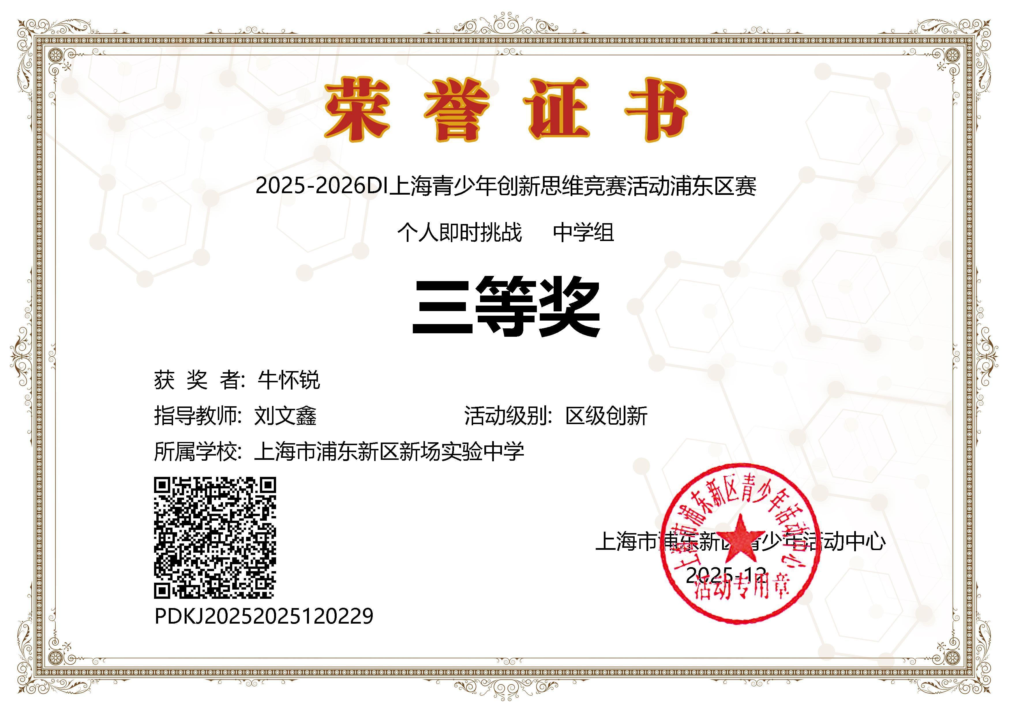 | 牛怀锐获2025-2026 DI上海青少年创新思维竞赛活动浦东赛区个人即时挑战三等奖 |