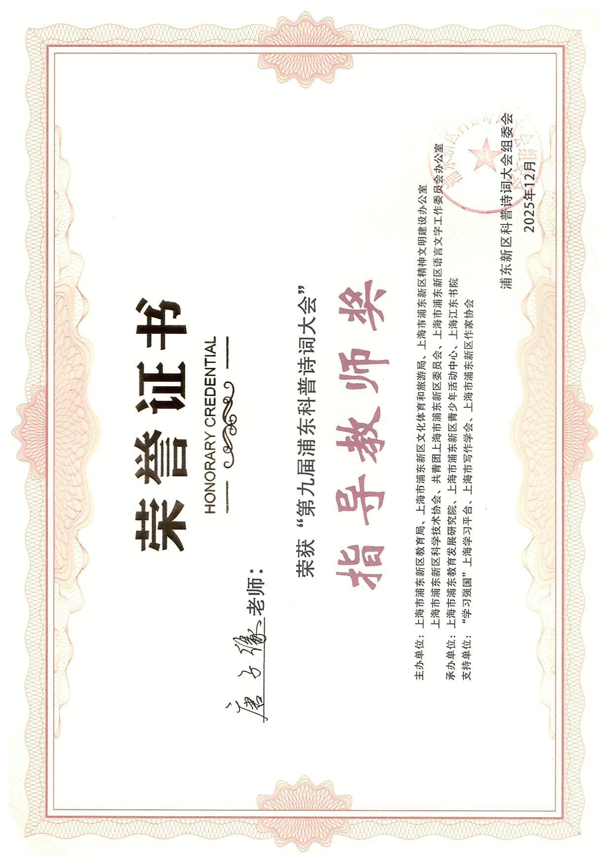 | 唐子缘获第九届浦东科普诗词大会指导教师奖 |