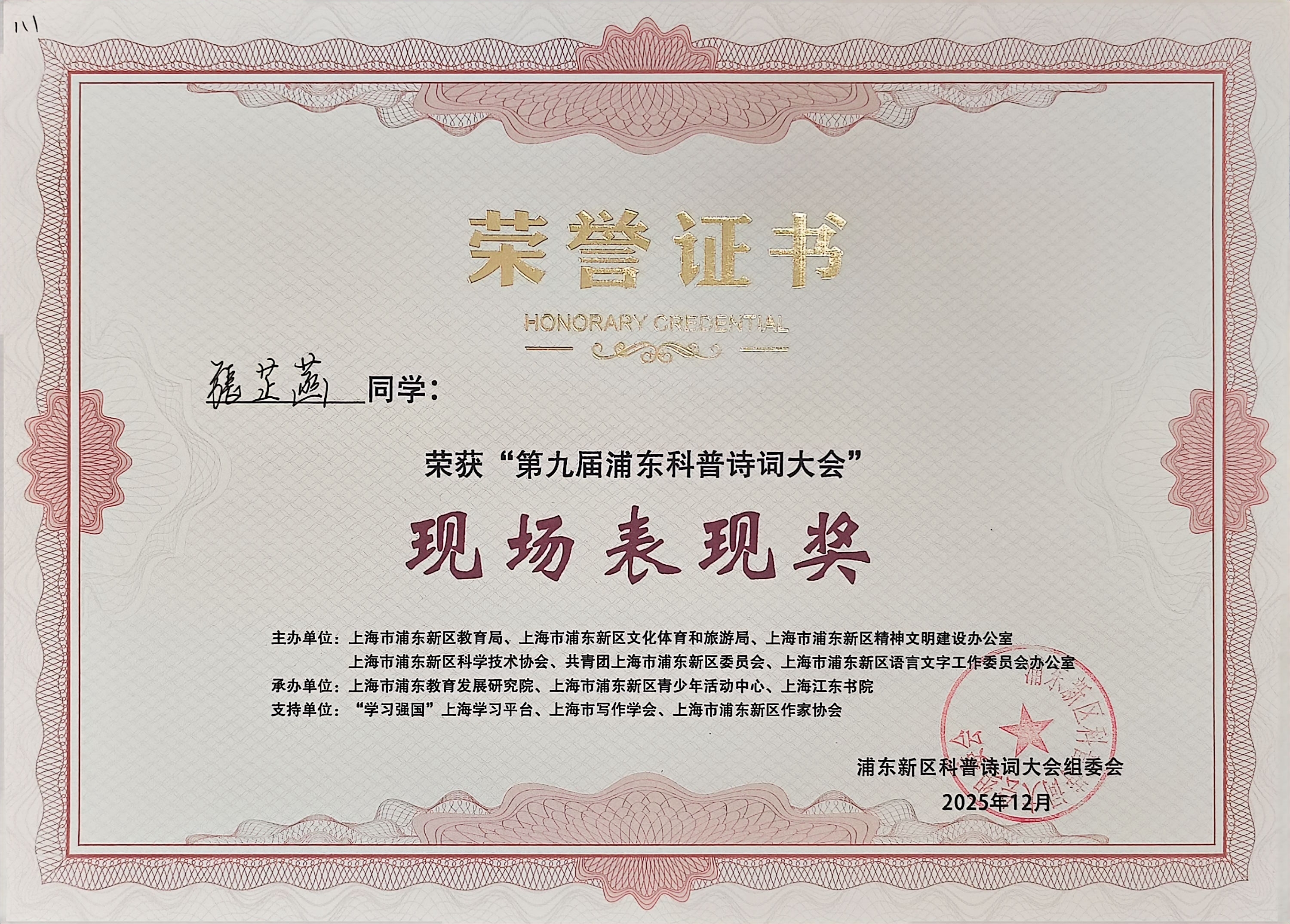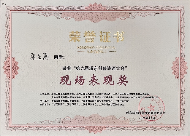 张芷菡获第九届浦东科普诗词大会现场表现奖