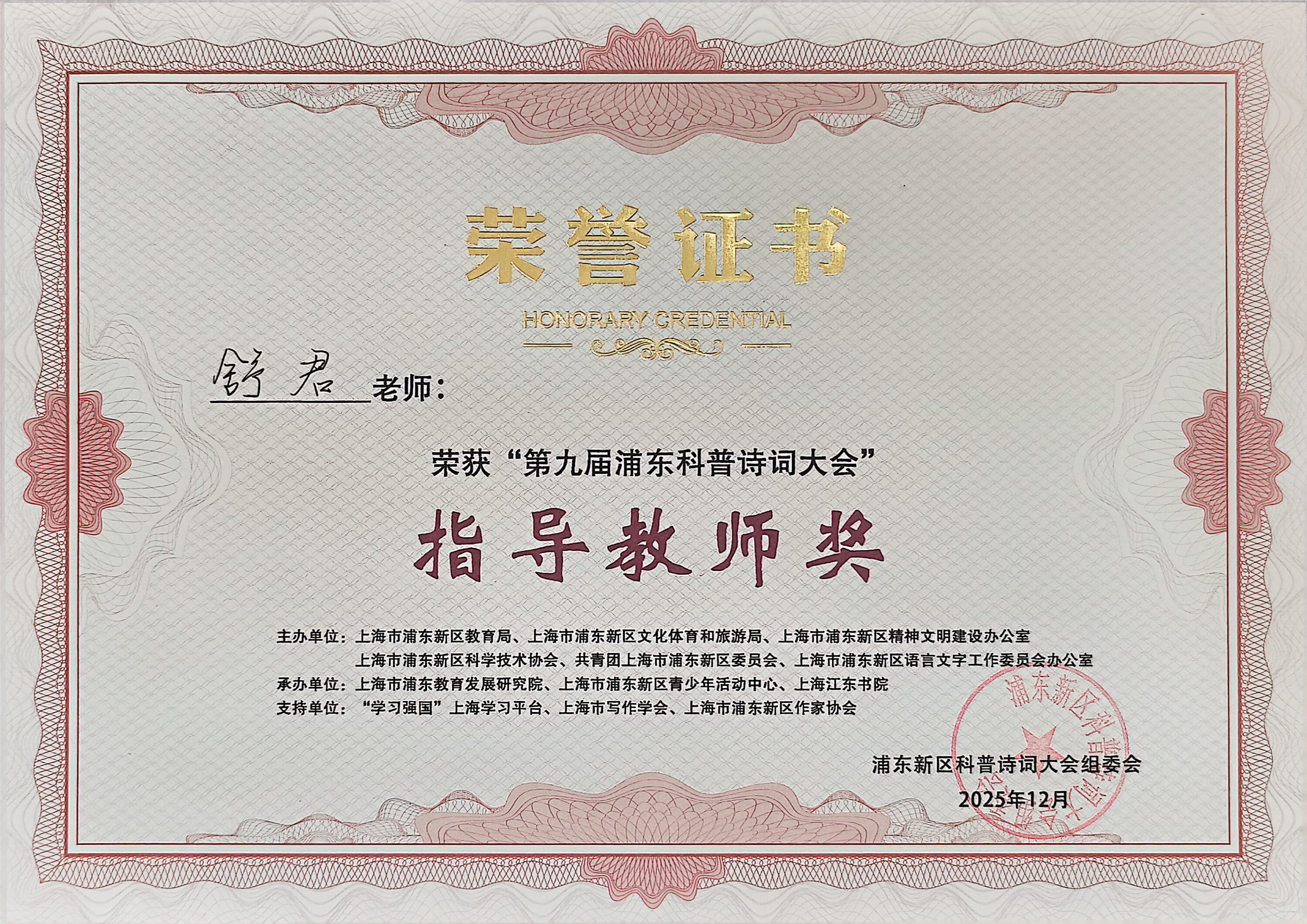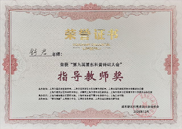 | 舒君获第九届浦东科普诗词大会指导教师奖 |