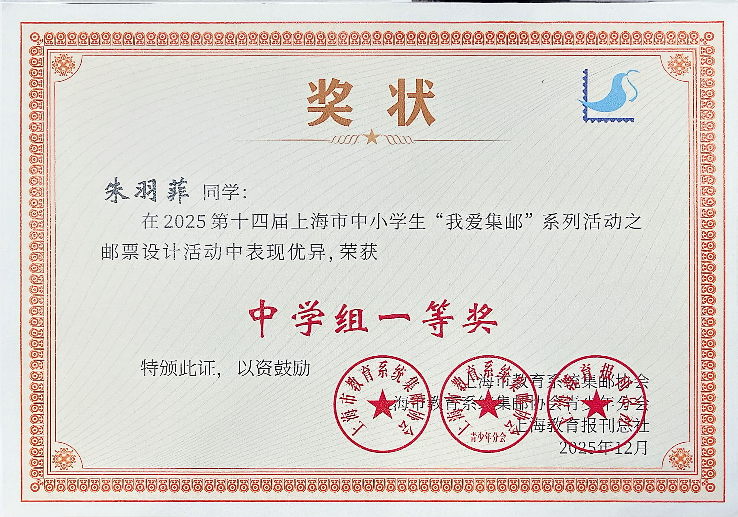 | 朱羽菲获2025第十四届上海市中小学生我爱集邮邮票设计活动中学组一等奖 |