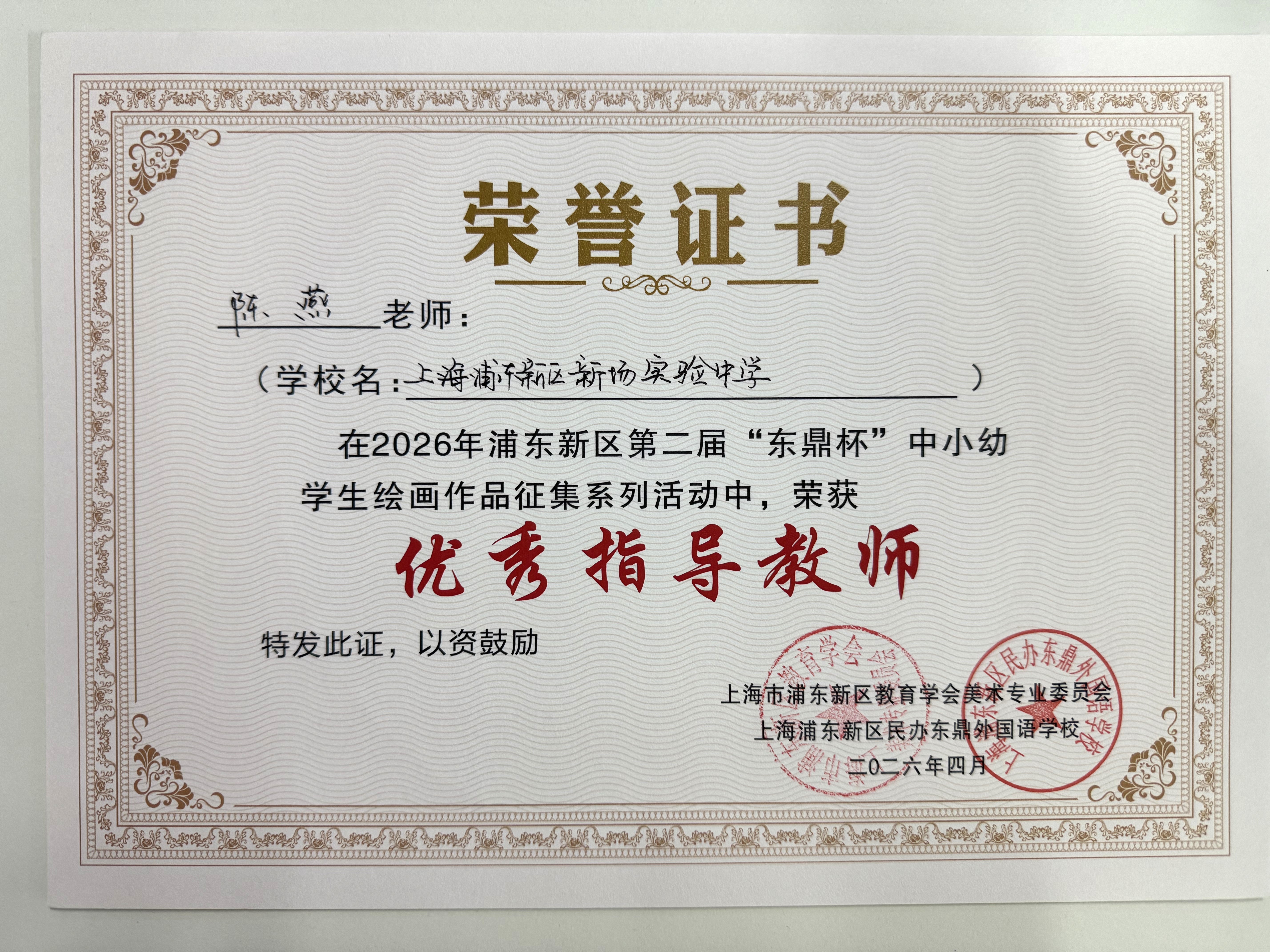 | 陈燕获2026年浦东新区第二届“东鼎杯”中小幼学生绘画作品征集系列活动优秀指导教师 |