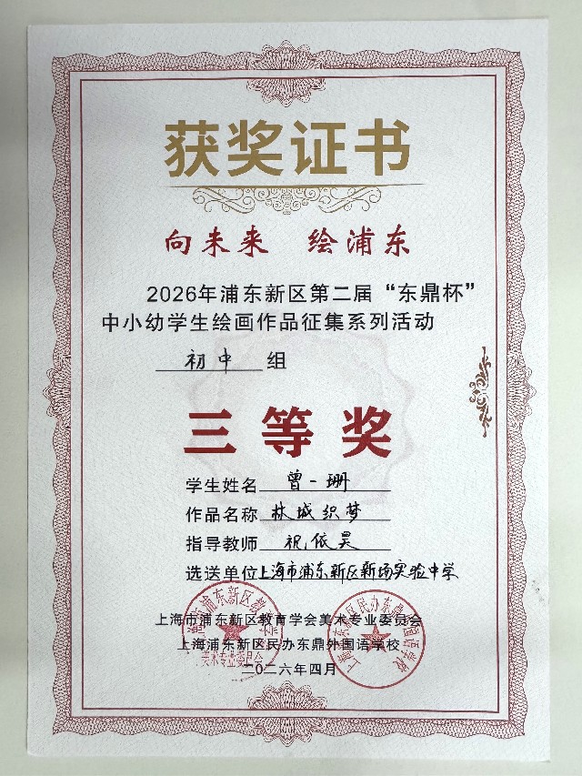 | 曾一珊获2026年浦东新区第二届“东鼎杯”中小幼学生绘画作品征集系列活动初中组三等奖 |
