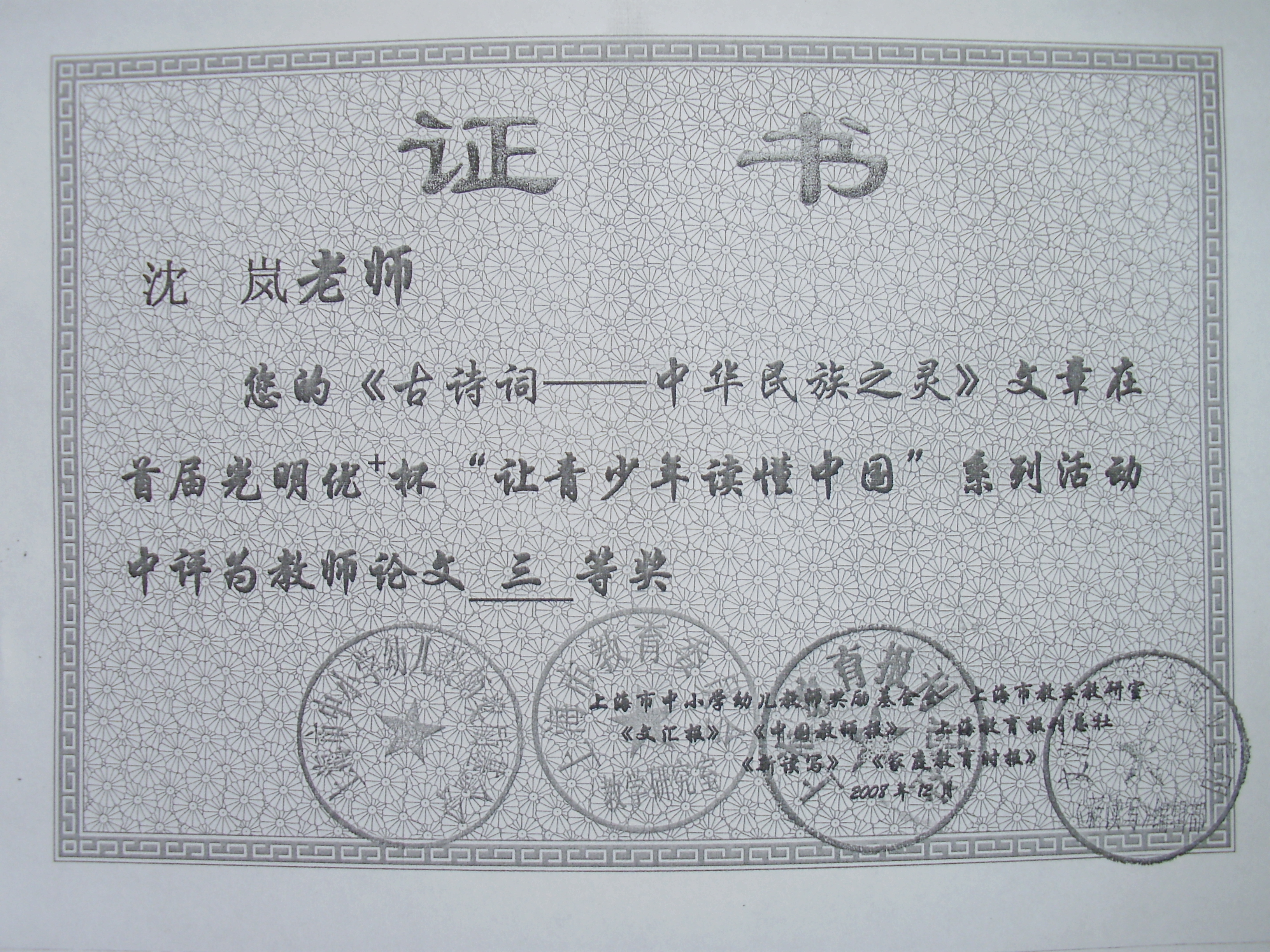 | 沈岚获首届光明优+杯“让青少年读懂中国”系列活动中教师论文三等奖 |