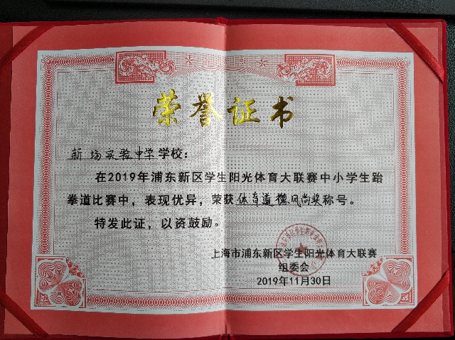 | 新场实验中学获在2019年浦东新区学生阳光体育大联赛中小学生跆拳道比赛中,表现优异,荣获体育道德风尚奖 |