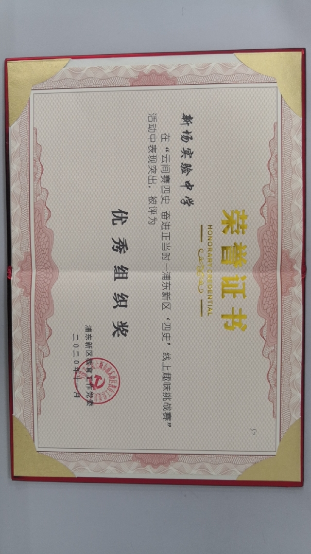 | 新场实验中学获“云间赛四史奋进正当时——浦东新区‘四史’线上趣味挑战赛“活动优秀组织奖 |