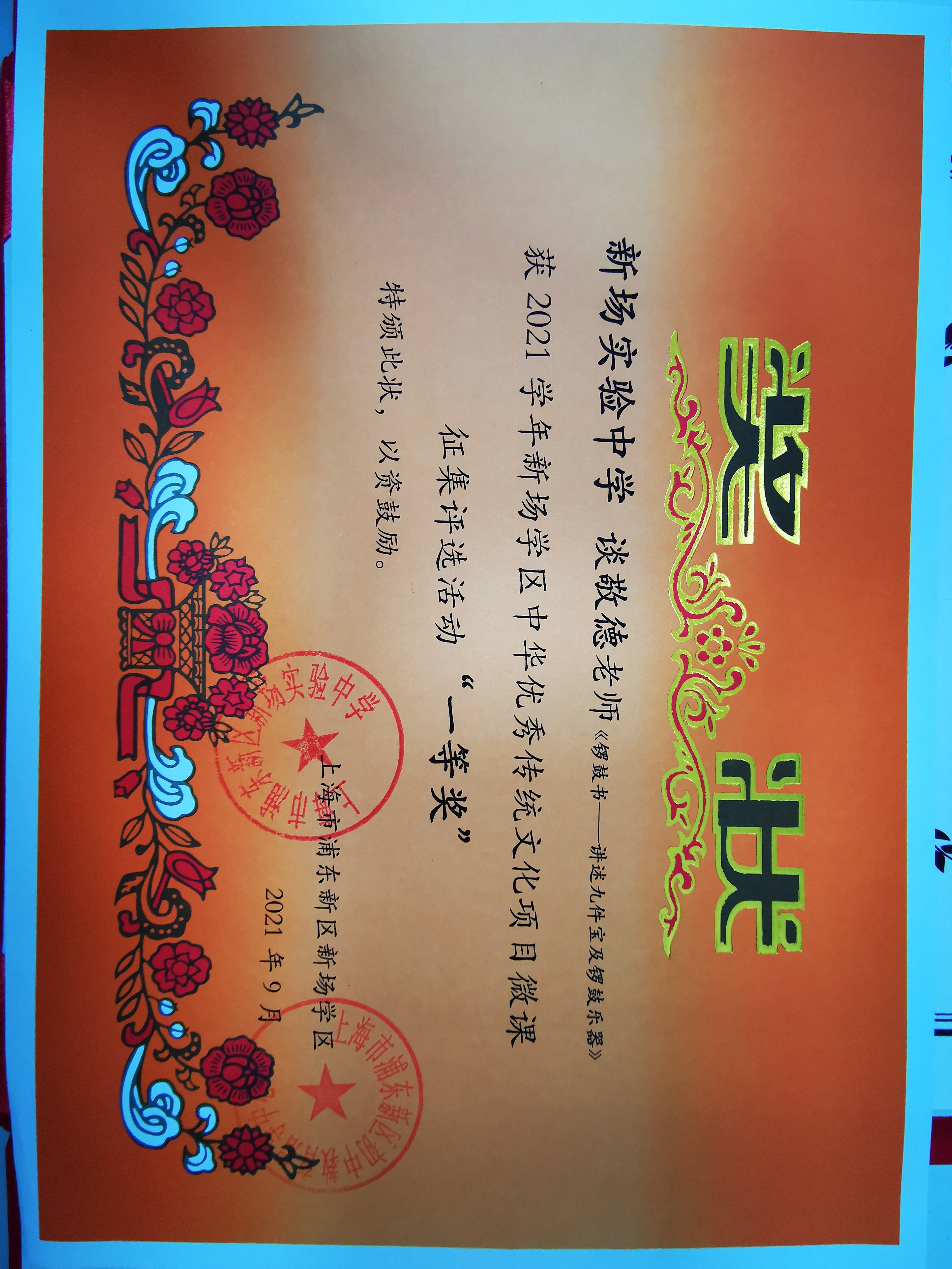 | 新场实验中学获《锣鼓书——讲述九件宝及锣鼓乐器》获2021学年新场学区中华优秀传统文化项目微课征集评选活动一等奖 |