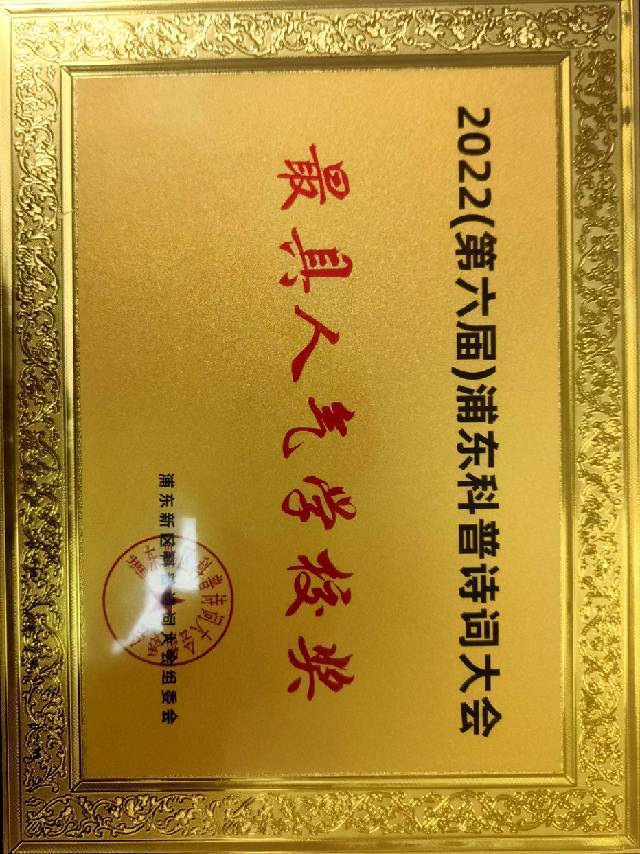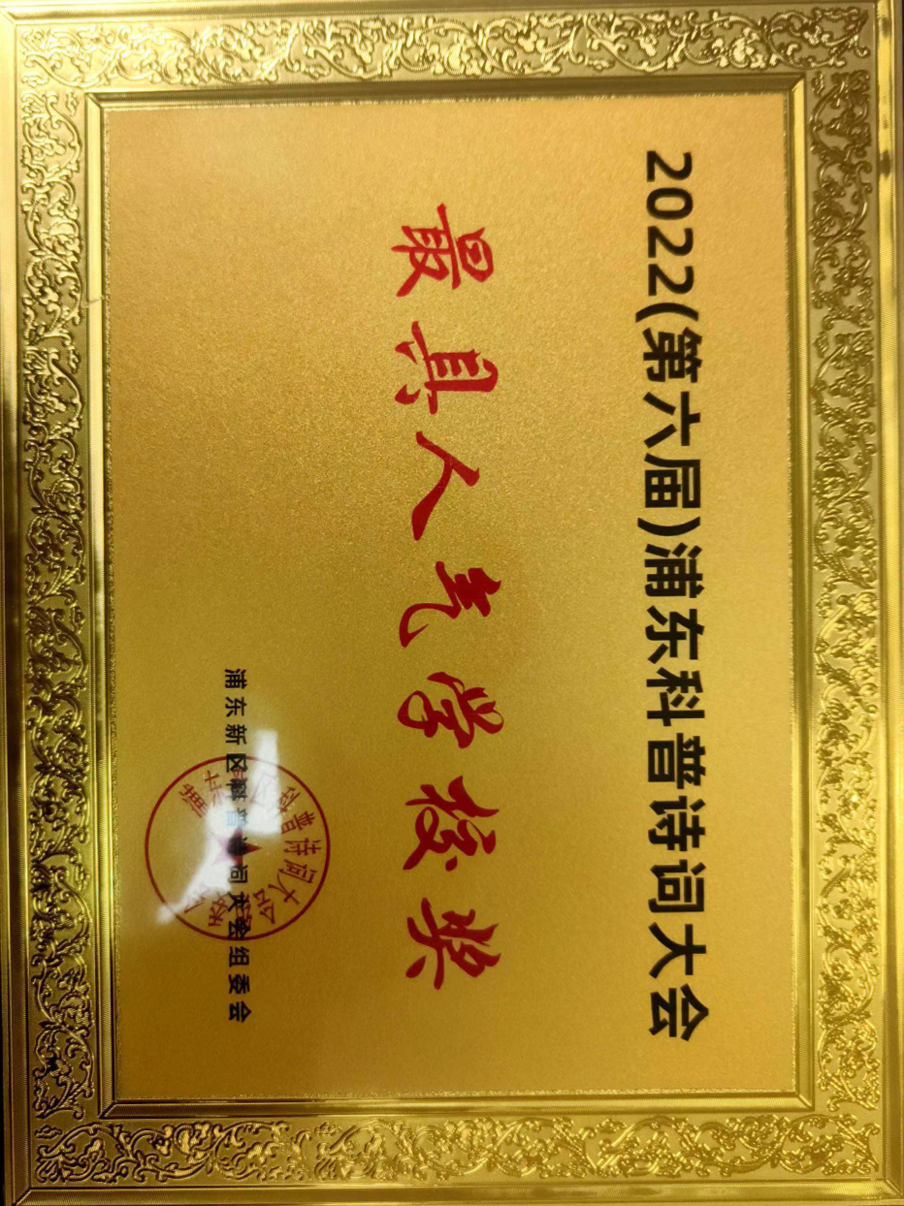 | 上海市浦东新区新场实验中学获2022(第六届)浦东科普诗词大会最具人气学校奖 |