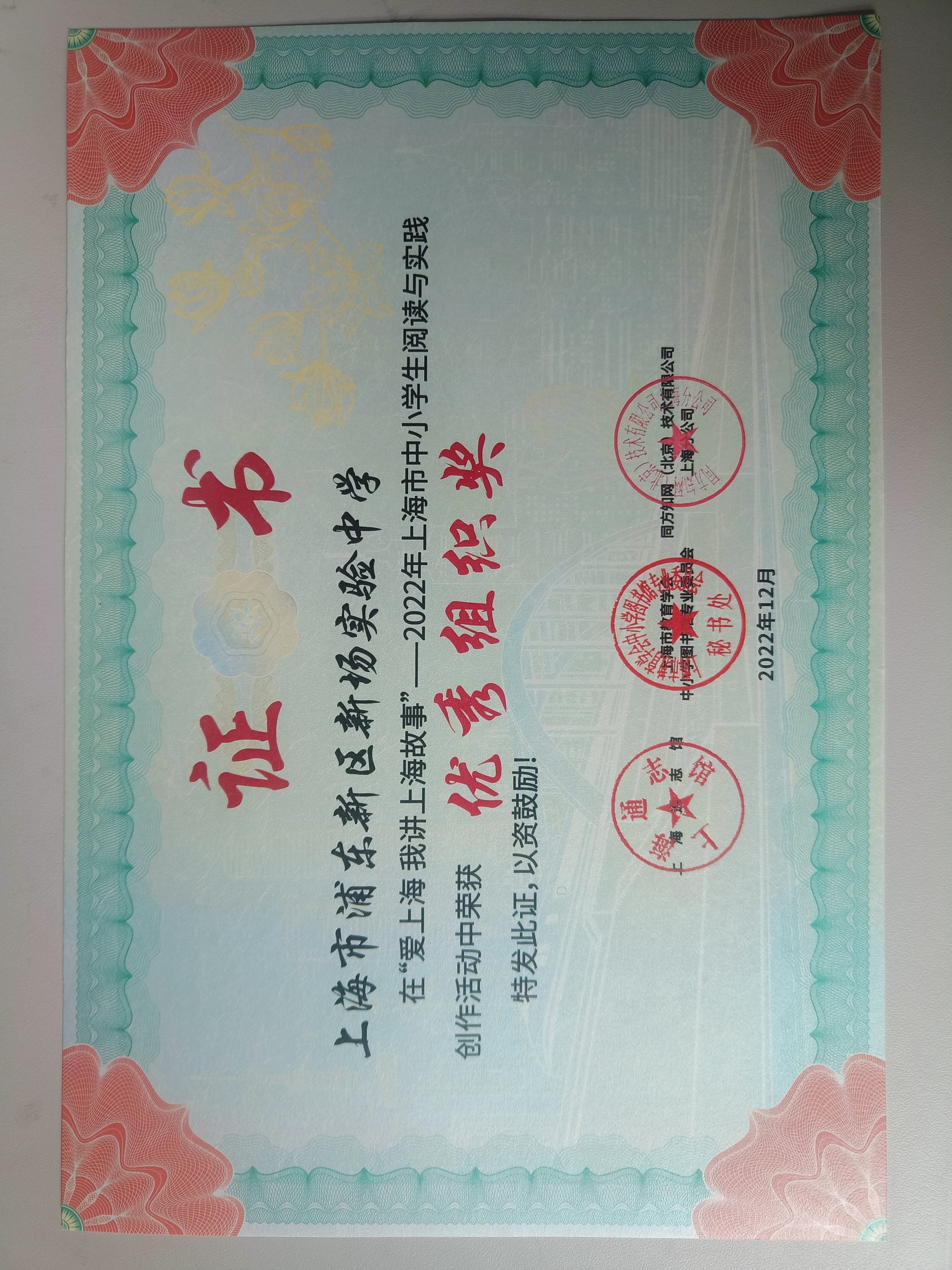 | 上海市浦东新区新场实验中学获在“爱上海我讲上海故事”--2022年上海市中小学生阅读实践创作中荣获优秀组织奖 |