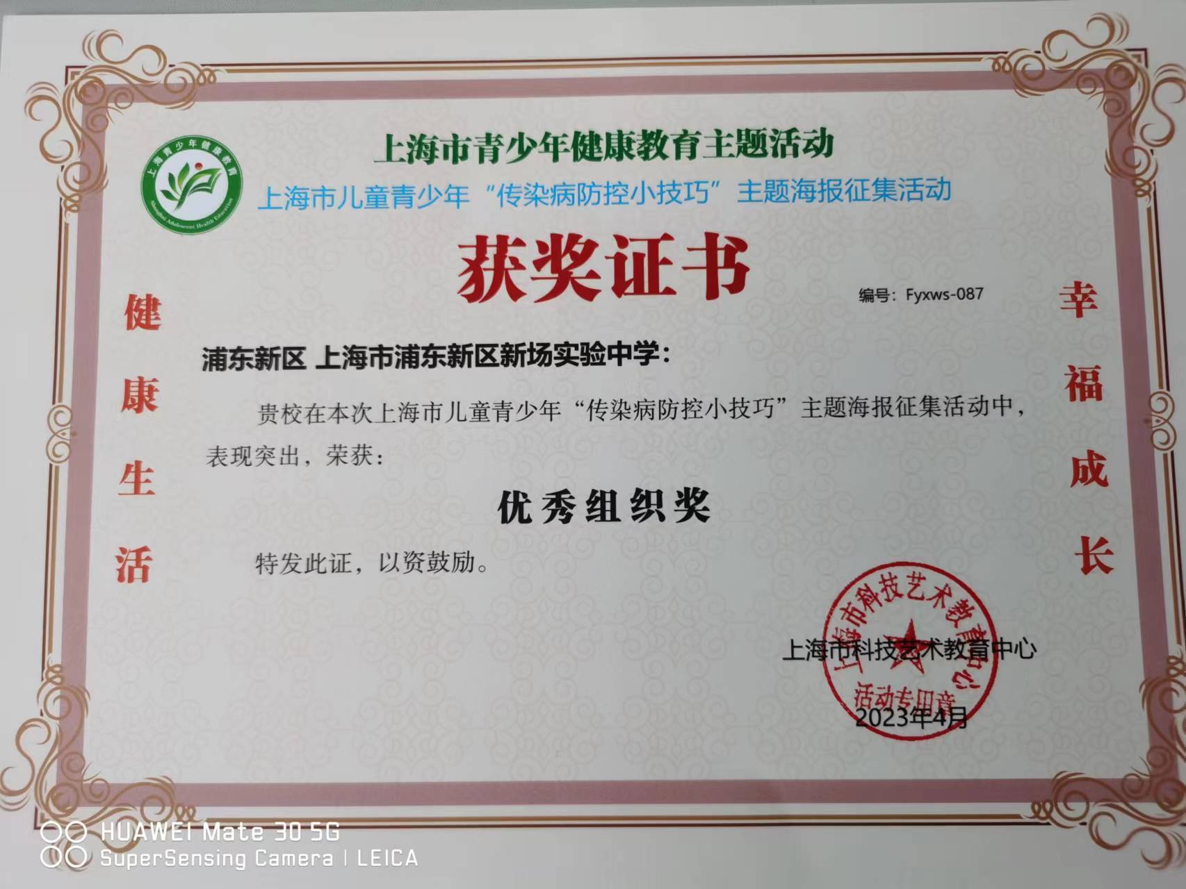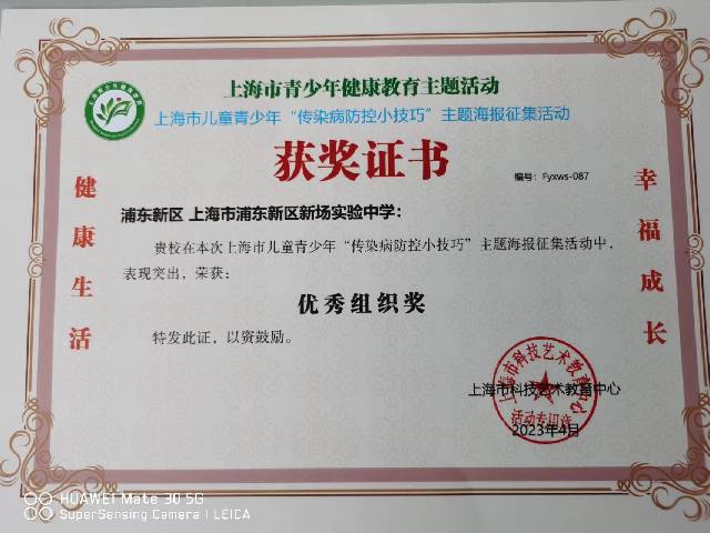 | 上海市浦东新区新场实验中学获贵校在上海市儿童青少年“传染病防控小技巧”主题海报征集活动中表现突出,荣获优秀组织奖 |
