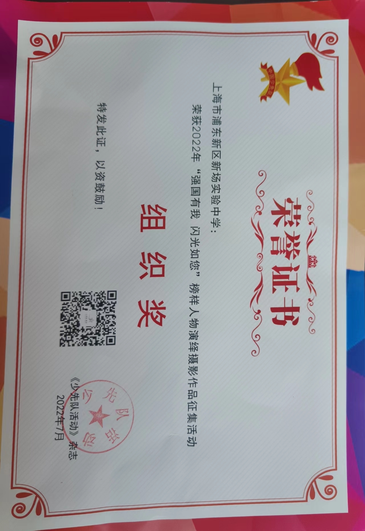 | 上海市浦东新区新场实验中学获荣获2022年“强国有我闪光如您”榜样人物演绎摄影作品征集活动组织奖 |