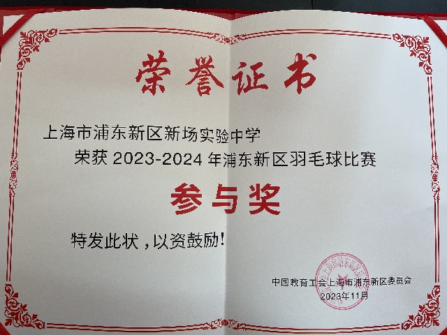 | 上海市浦东新区新场实验中学获2023——2024年浦东新区羽毛球比赛参与奖 |