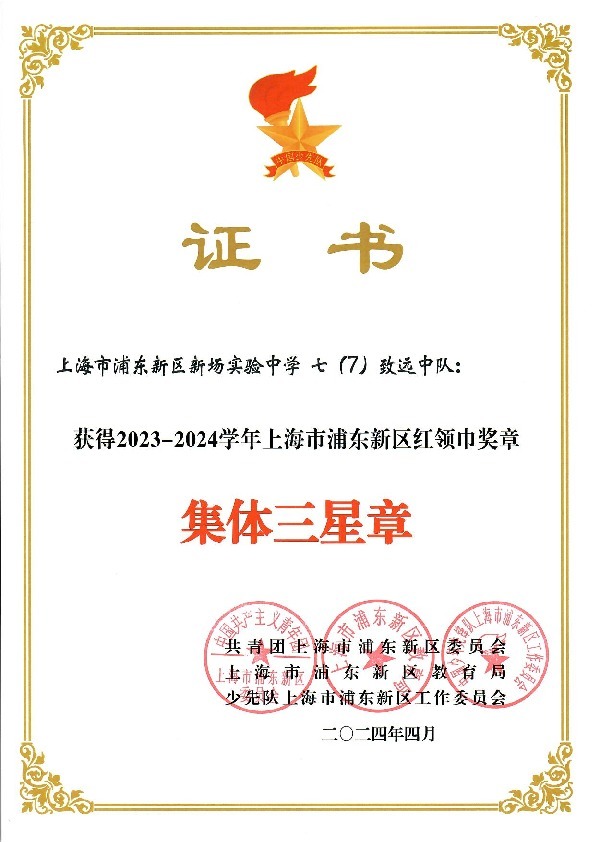 | 七7致远中队获2023-2024学年上海市浦东新区红领巾奖章集体三星章 |