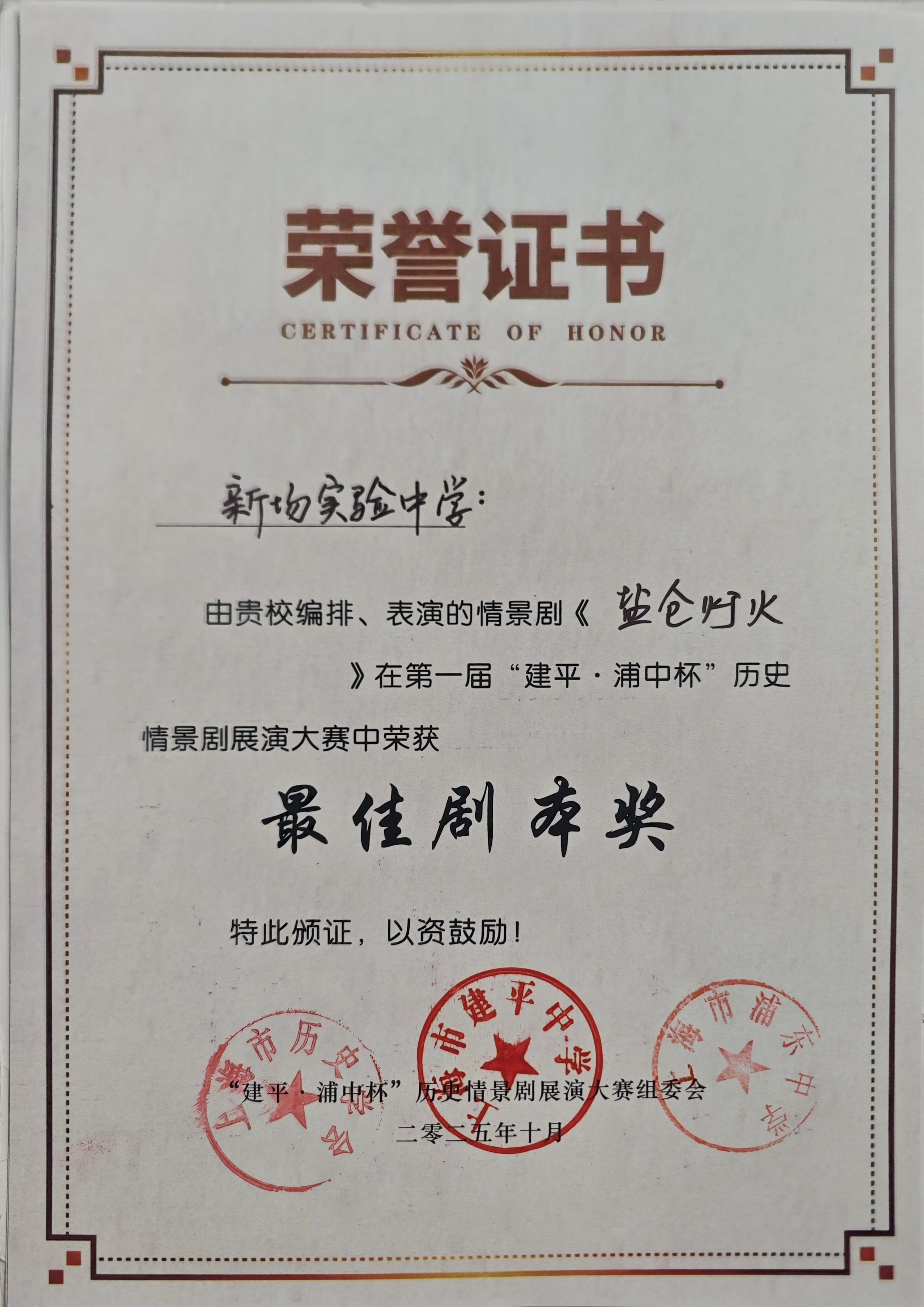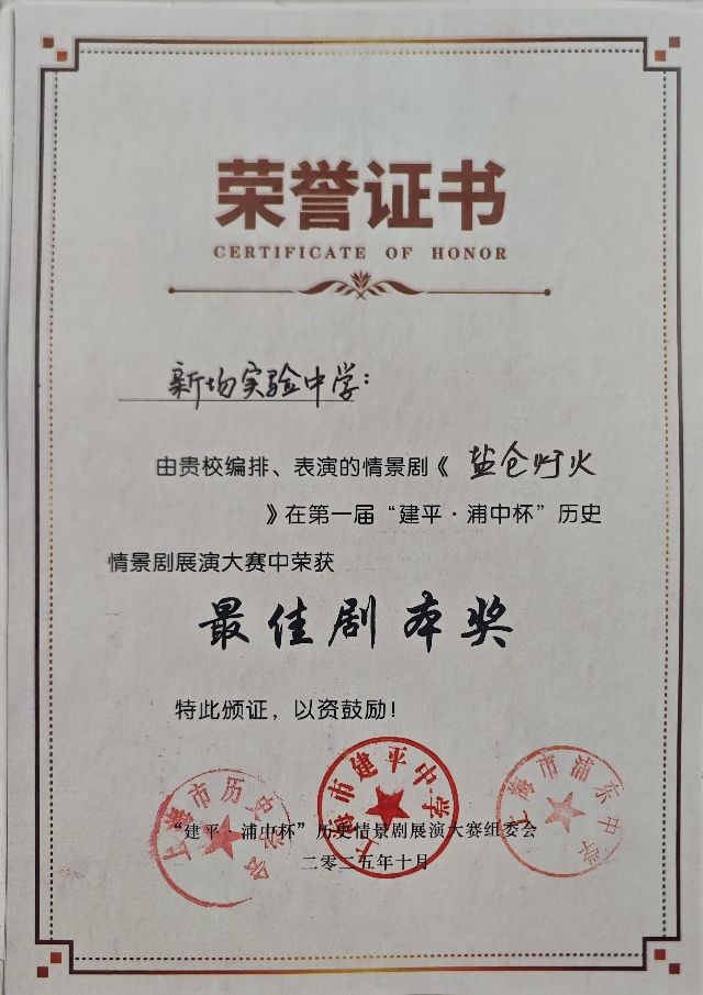 新场实验中学获情景剧《盐仓灯火》最佳剧本奖