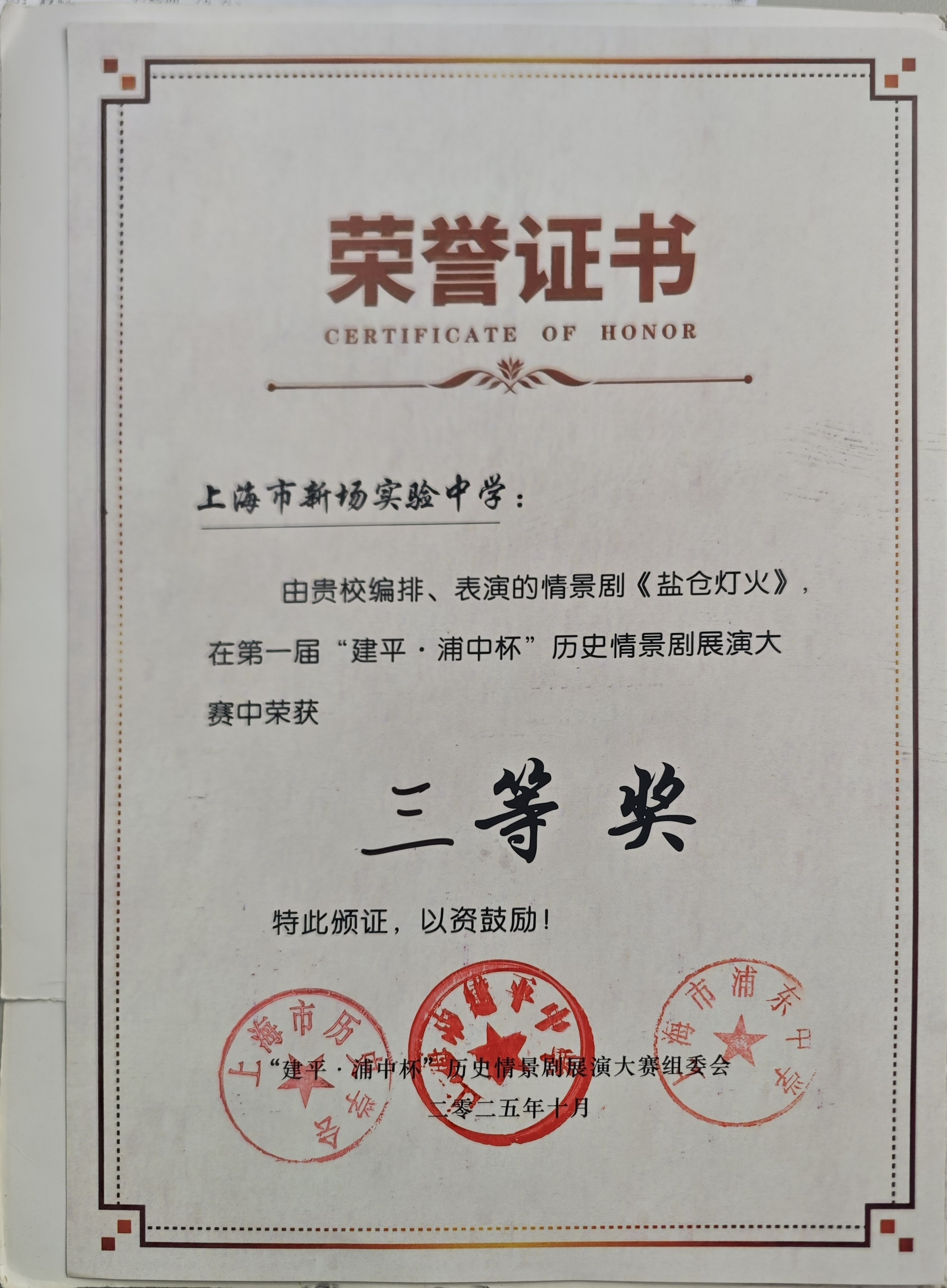 新场实验中学获情景剧《盐仓灯火》三等奖