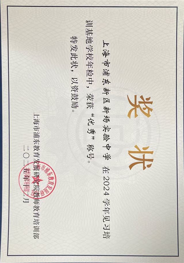 | 新场实验中学获2024学年见习培训基地学校年检中荣获“优秀”称号优秀 |