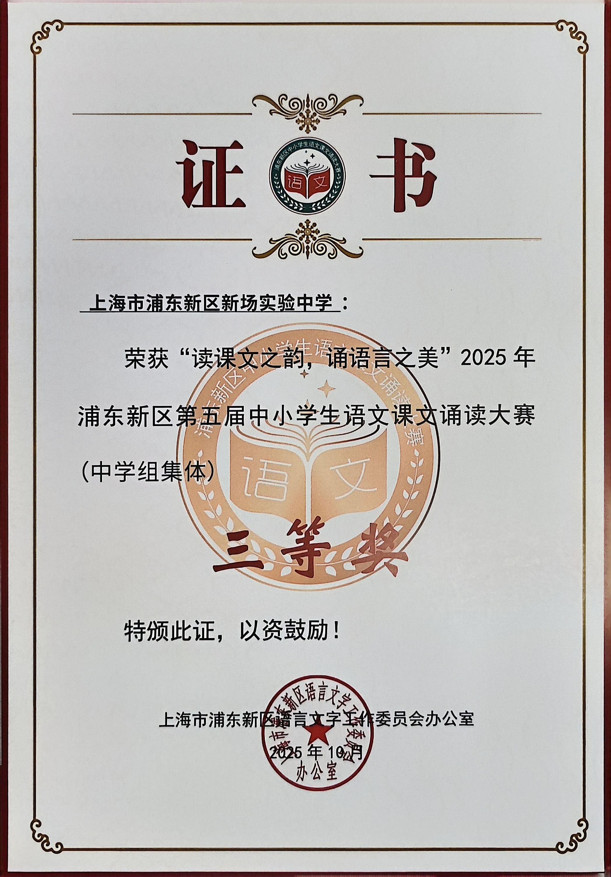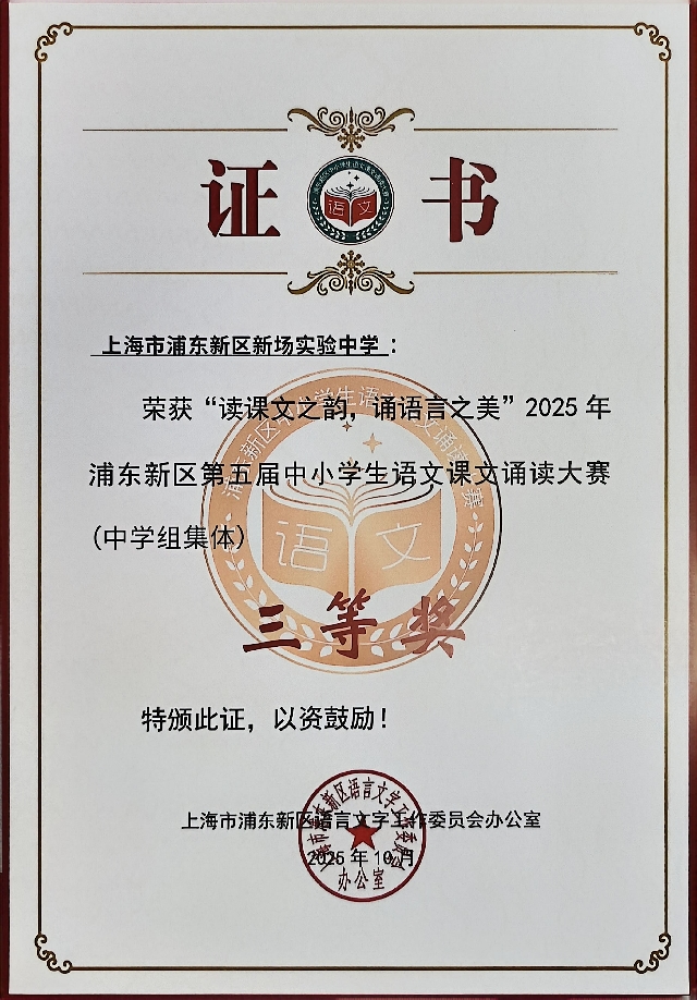 | 上海市浦东新区新场实验中学获“读课文之韵,诵语言之美”2025年浦东新区第五属中小学生语文课文诵读大赛 (中学组集体)三等奖 |