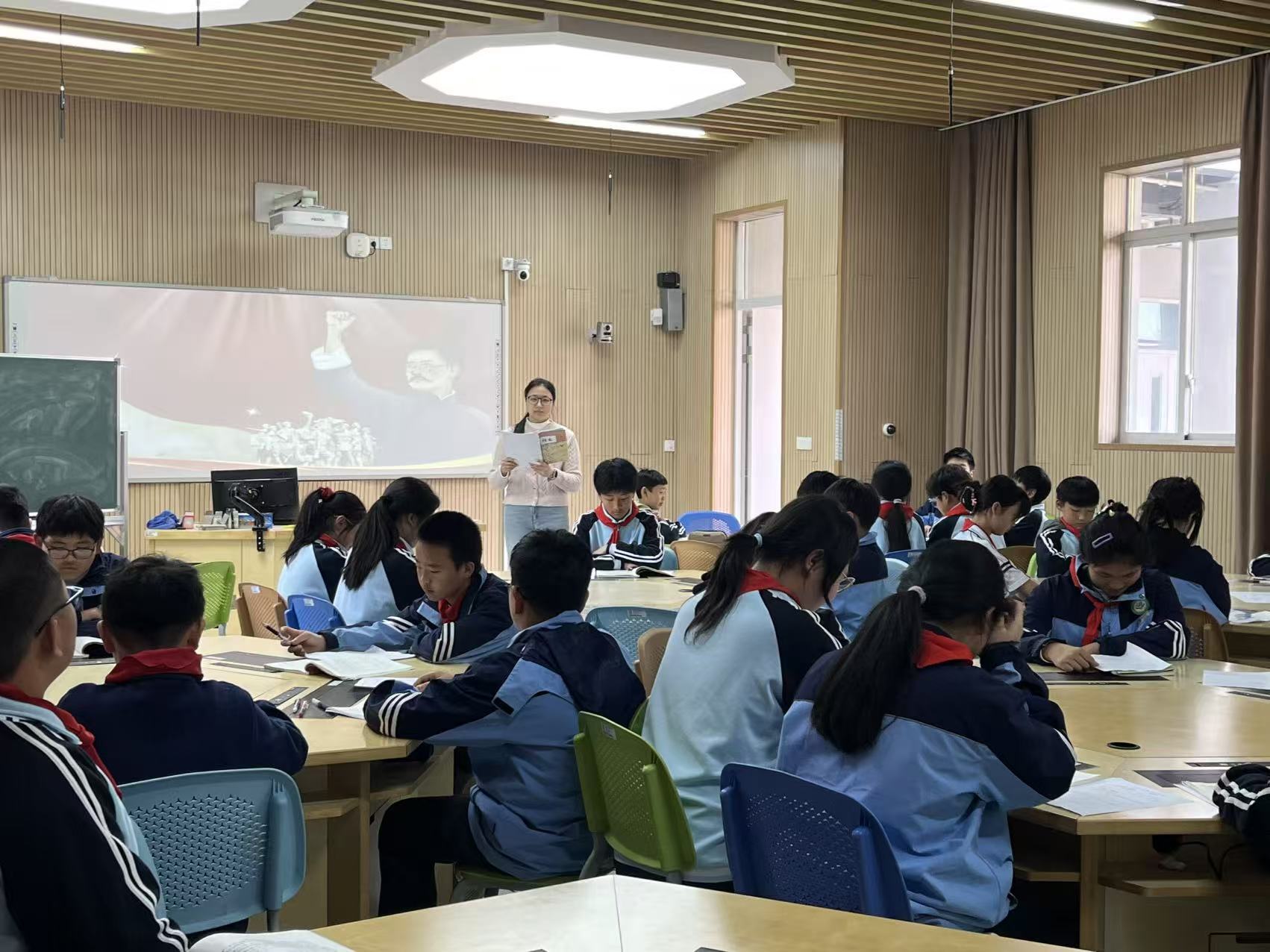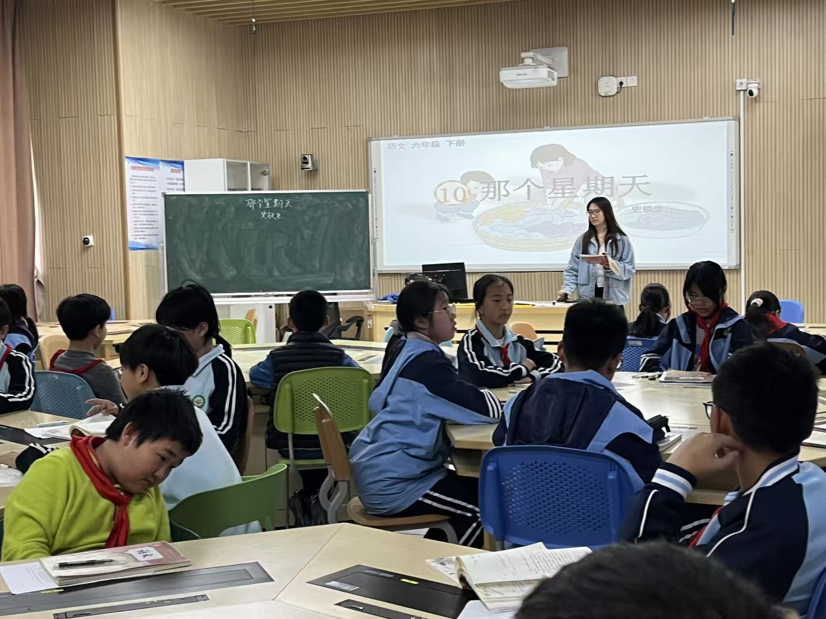 活动伊始,见习教师康琎源老师、朱奕欣老师依次进行课堂教学展示,为大家呈现了两节各具特色的语文公开课。康老师执教《十六年前的回忆》,课堂上紧扣文本,引导学生通过品析重点语句,体会李大钊的人物形象,感受主人公坚定的革命信仰与家国情怀。为更好突破教学难点,康老师采用多种教学策略,或让学生自主探究,或适时补充背景点拨,更联结目前战乱让学生体会和平的来之不易,引发“新时代少年如何传承红色精神”的思考,让红色精神的浸润落地。朱老师带来《那个星期天》的教学,紧扣文中的细节描写,分别从融情于事、融情于人、融情于景三个板块,引导学生感悟作家的情感,并创设情境激发学生关注自我生活体验,读写结合表达自己的真情实感。